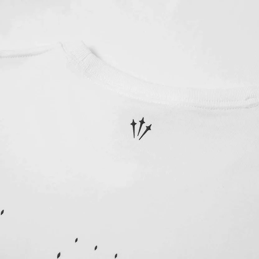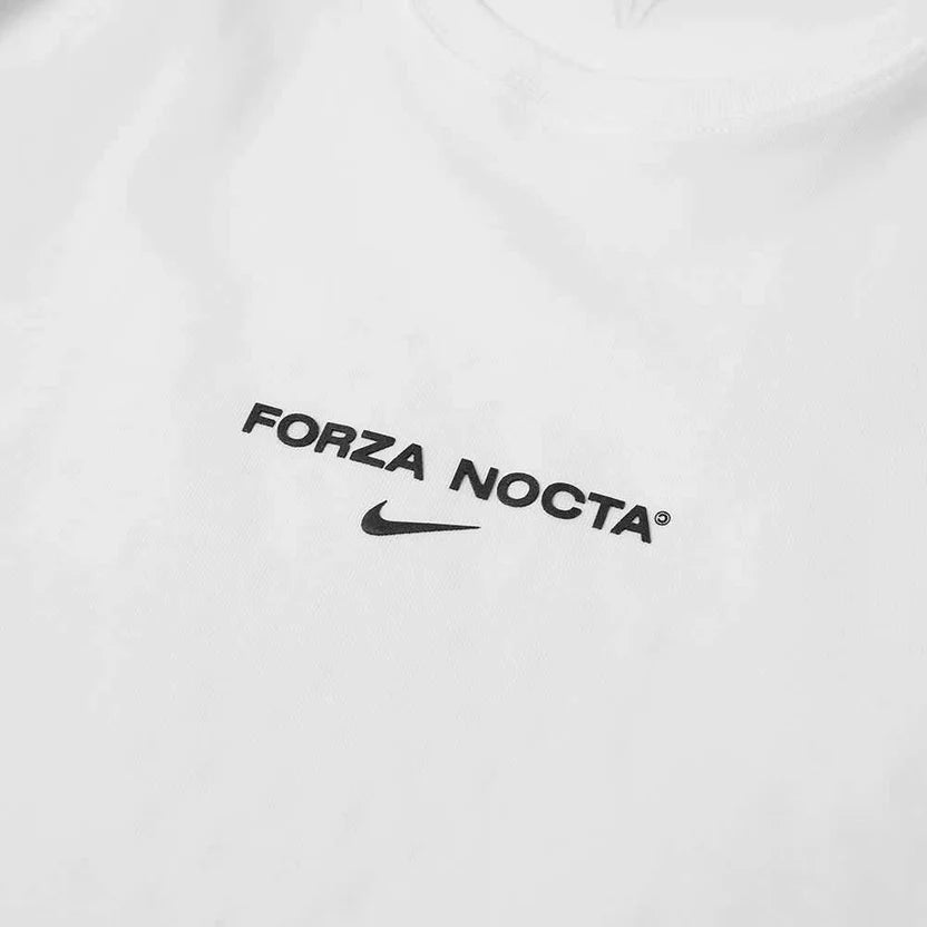 The white Nike x Drake NOCTA T-shirt features a black "FORZA NOCTA" logo above a Swoosh logo on the front. Translated, the phrase is believed to mean "nocturnal force" or "force of the night" which would make sense considering the theme behind the Nike x Drake NOCTA imprint is "the spirit of the night."